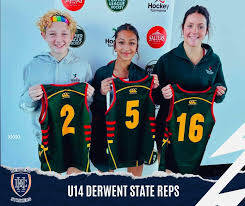 Derwent Hockey Club players part of the 2024 Tasmanian Under 14 Hockey Squad: (l-r) Zara, Annie, Claudia. Pic credit: Derwent Hockey Club